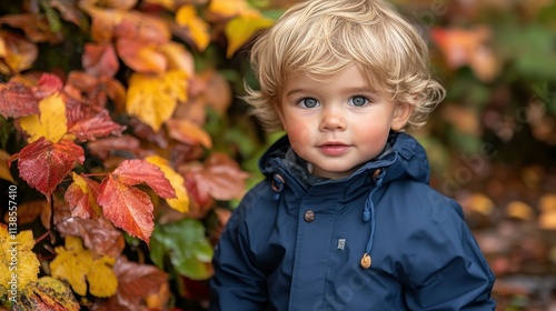 A young child with curly blonde hair stands in a park surrounded by vibrant autumn foliage. The boy wears a blue jacket and looks cheerfully at the camera, capturing the essence of fall