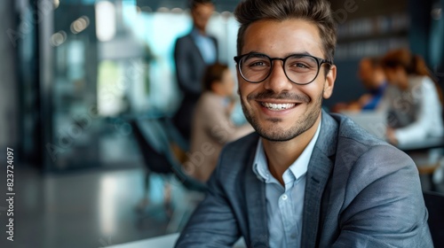 A young, confident businessman wearing glasses and a suit smiles at the camera, with colleagues in the background in a modern office setting