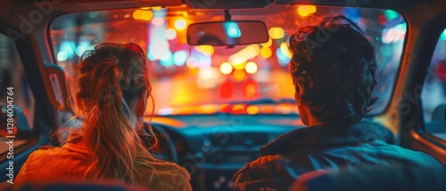 A young couple in a car against a backdrop of city lights, creating a sense of night adventure, would be suitable for advertising travel or romantic stories.