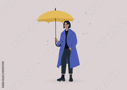 A young female character wearing an oversize coat and holding a yellow umbrella, a rainy weather concept
