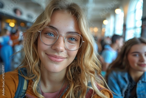 A young female with blonde hair, blue eyes, and glasses smiles, in a busy environment