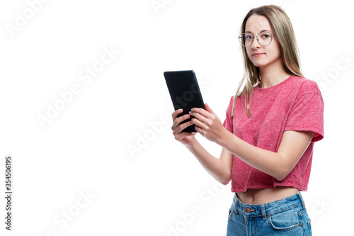 A young girl in jeans with a tablet in her hands. Isolated on a white background. Space for text.