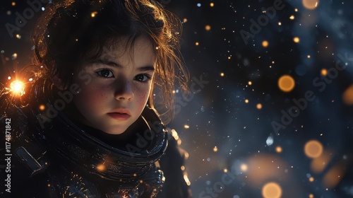 A young girl of Hispanic descent in a reflective astronaut suit gazes intently, surrounded by a cosmic atmosphere.