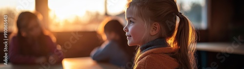 A young girl smiles in a warm classroom, illuminated by sunset, capturing the joy of learning and friendship.
