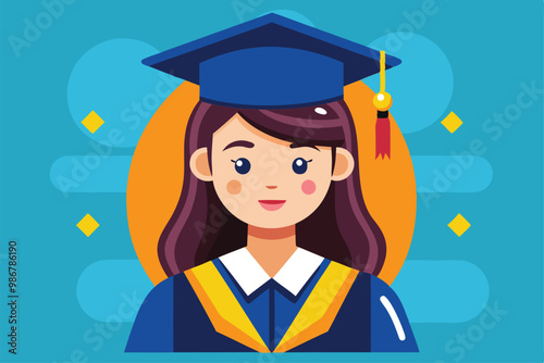 A young girl wearing a graduation cap and gown proudly smiling, celebrating her educational achievement, Customizable cartoon illustration of a girl graduating
