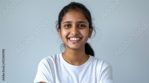 A young girl with a joyful expression stands against a simple blue background, wearing a white t-shirt and exuding happiness and innocence.