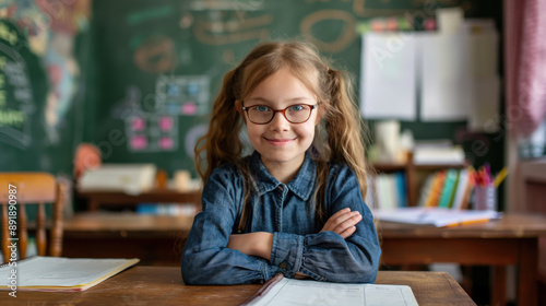 A young girl with pigtails sits at a desk in a classroom, smiling at the camera