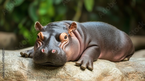 A young hippopotamus lounges on a rock, displaying its round body and small ears, surrounded by lush greenery.