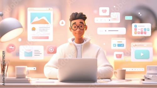 A young individual with glasses sits at a desk, happily working on a laptop.