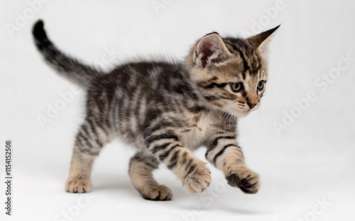 A young kitten, possibly a few weeks old, in mid-stride. It has a striped fur pattern, predominantly in shades of brown and gray.