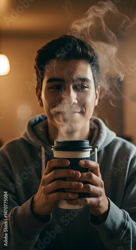 A young man holds a steaming cup of coffee, its heat rising in wisps, capturing a moment of warmth and serenity in a cozy indoor setting.