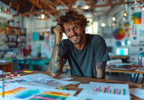 A young man in a creative studio, surrounded by colorful charts and drafts, pulling his hair in frustration