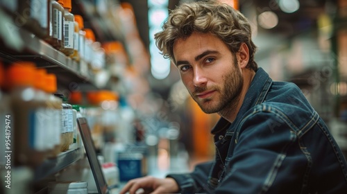 A young man in a denim jacket is working on a laptop in a lab environment, surrounded by shelves filled with jars suitable for depicting scientific research, lab work, or modern workspace themes,