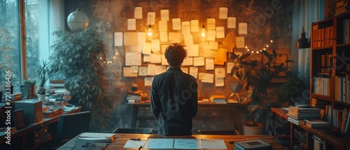 A young man looking on planning board carefully, a presentation in meeting in office, plan and startup creative concept,generative ai