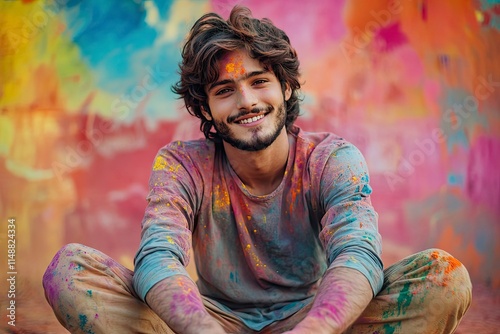 A YOUNG MAN SITTING AROUND HOLI COLOURS LOOKING AT CAMERA AND SMILING