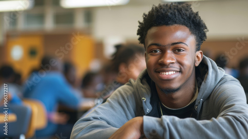 A young man smiles confidently while sitting in a classroom, with students and desks in the blurred background.