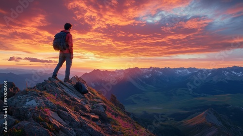 A young man triumphs on a mountain, embracing adventure against a vibrant sunset.