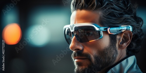 A young man wearing VR headset. Neon virtual glasses, and cyberpunk gear. Generative AI.