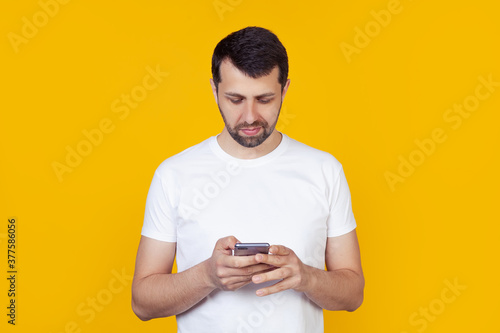 A young man with a beard in a white T-shirt holds in his hand and looking into a smartphone looking for information on the Internet, a natural expression, stands on an isolated yellow background