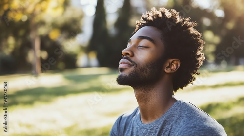 A young man with a beard is taking a deep breath.