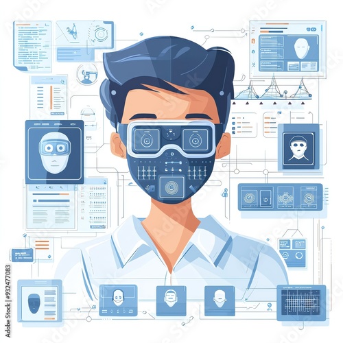 A young man with a digital mask, surrounded by face recognition data and technology, illustrating modern security concepts.