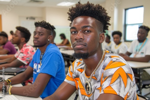 A young man with a serious expression on his face is sitting in a classroom. He is wearing a colorful shirt and has a chain around his neck.