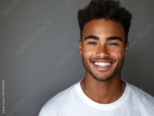a young man with an inviting smile on a soft gray backdrop, emphasizing his bright teeth and happy demeanor, creating a fresh and approachable image perfect for wellness themes