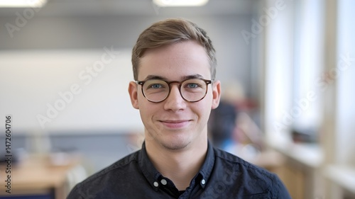 A young man with eyeglasses in a casual indoor setting, captured in a medium close-up shot