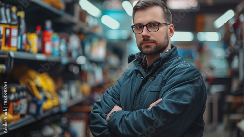 A young man with glasses stands with arms crossed in a well-stocked hardware store, showcasing a confident demeanor amidst various tools and supplies