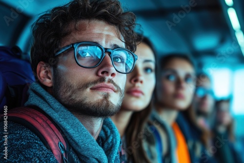 A young man with glasses stares thoughtfully forward in a bustling subway scene, surrounded by other travelers, capturing a moment of quiet reflection amidst chaos.