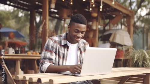 A Young Man Working on a Laptop at a Picnic Table. Fictional characters created by Generated AI.