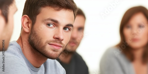 A young man's contemplative expression amidst a group discussion emphasizes the importance of engagement, connection, and thoughtful insight in interpersonal settings.