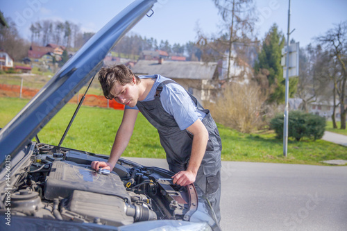A young mechanic is observing the engine in the car and what the problem may be.