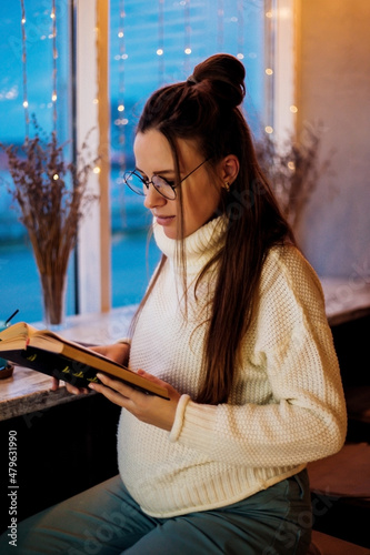 A young pregnant woman is sitting, resting in a cafe and reading a book with glasses.Waiting for the birth of a child.