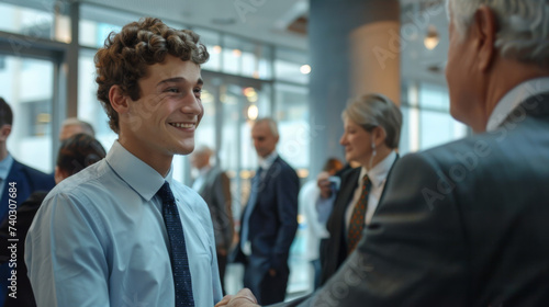 A young professional is shaking hands and exchanging smiles with a colleague in a corporate setting, reflecting a positive business interaction.