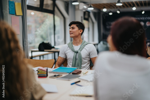 A young student actively participates in a classroom discussion, fostering a collaborative and engaging learning environment. He is surrounded by notebooks and peers, embodying a focus on education