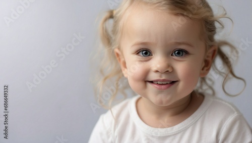 A young white child with curly blonde hair and blue eyes smiles brightly, wearing a simple white top against a grey background