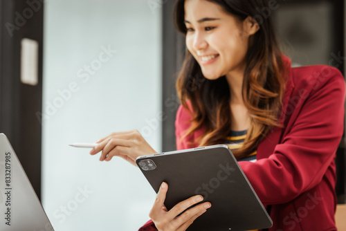 A young woman and other Asian individuals in formal suits are seen working at desks with laptops, portraying a successful and happy demeanor.