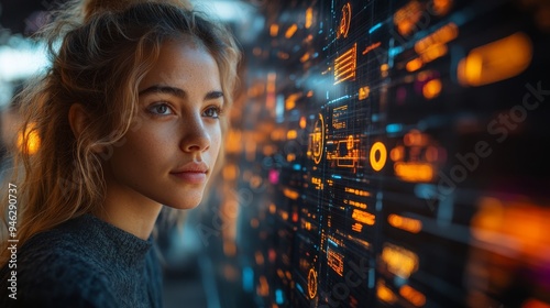 A young woman engages with a holographic interface displaying vibrant data overlays for efficient organization in a contemporary office setting.