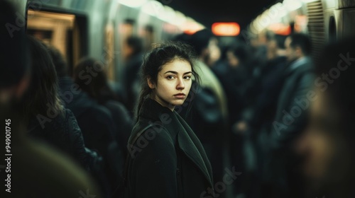 A Young Woman Gazes Thoughtfully Amidst a Crowded Subway in the Evening
