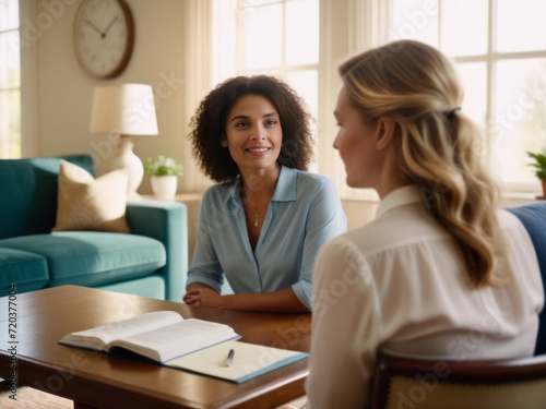 A young woman in a business suit sits on a chair at a table in an office and talks to another woman.