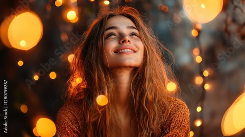 A young woman radiates happiness and tranquility with a beaming smile, enveloped in warm, glowing lights that create a magical and serene atmosphere around her.