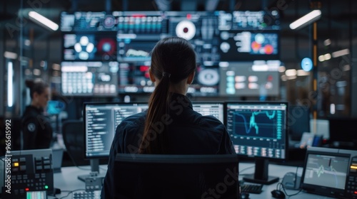A young woman sits at a computer screen inside a spacious high-tech command center.