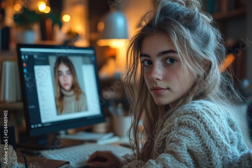 A young woman sits at her desk, immersed in her work. She is editing an artistic portrait of herself on a computer while surrounded by soft, warm lighting that enhances her focused expression