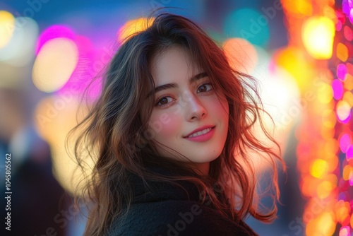 A young woman smiles brightly amidst colorful lights in a vibrant urban setting.
