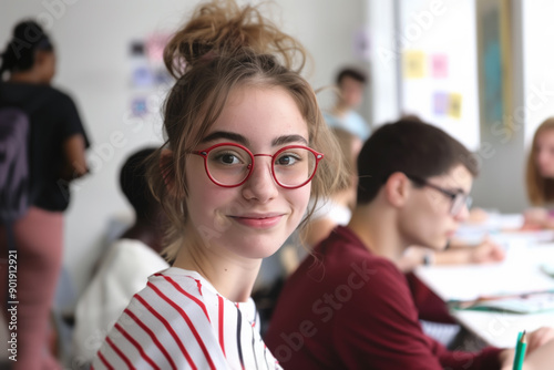 A young woman smiles warmly in a classroom setting. She is surrounded by other students who are focused on their work, creating a vibrant learning environment.
