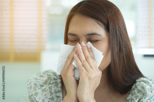 A young woman sneezing into a tissue, showing symptoms of a cold or allergy. Healthcare, illness, and hygiene concept.