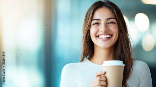 A young woman with a bright smile, holding a coffee cup, illuminated by soft light.