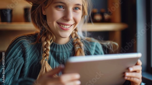 A young woman with braids and a warm sweater uses a tablet, smiling brightly in a cozy cafe. The ambient lighting and relaxed atmosphere make for a serene setting.