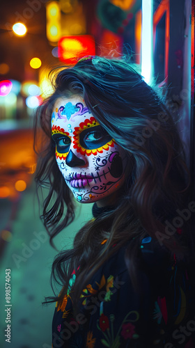 A young woman with colorful sugar skull makeup poses against a vibrant urban backdrop, showcasing intricate designs and a festive appearance during a cultural celebration